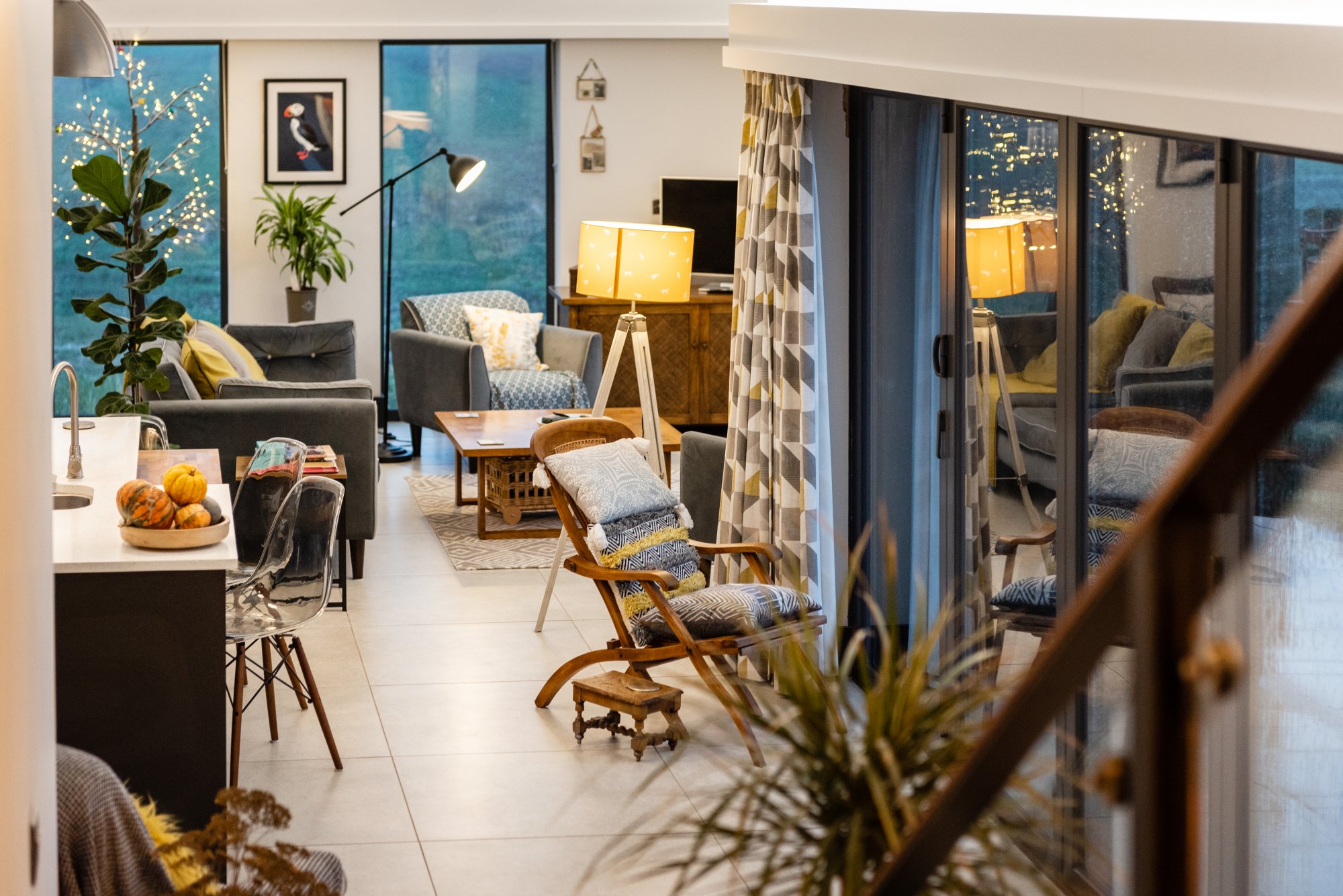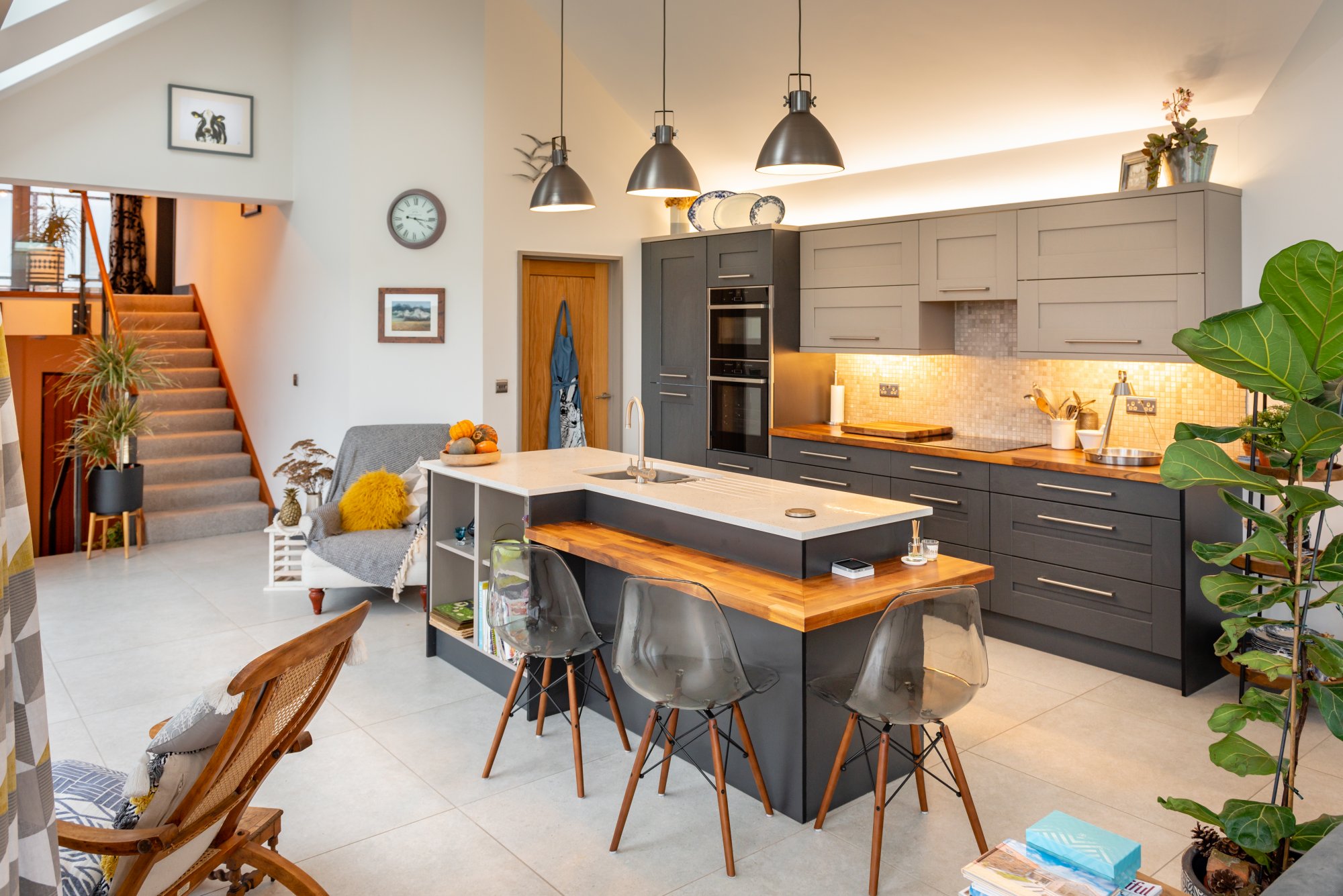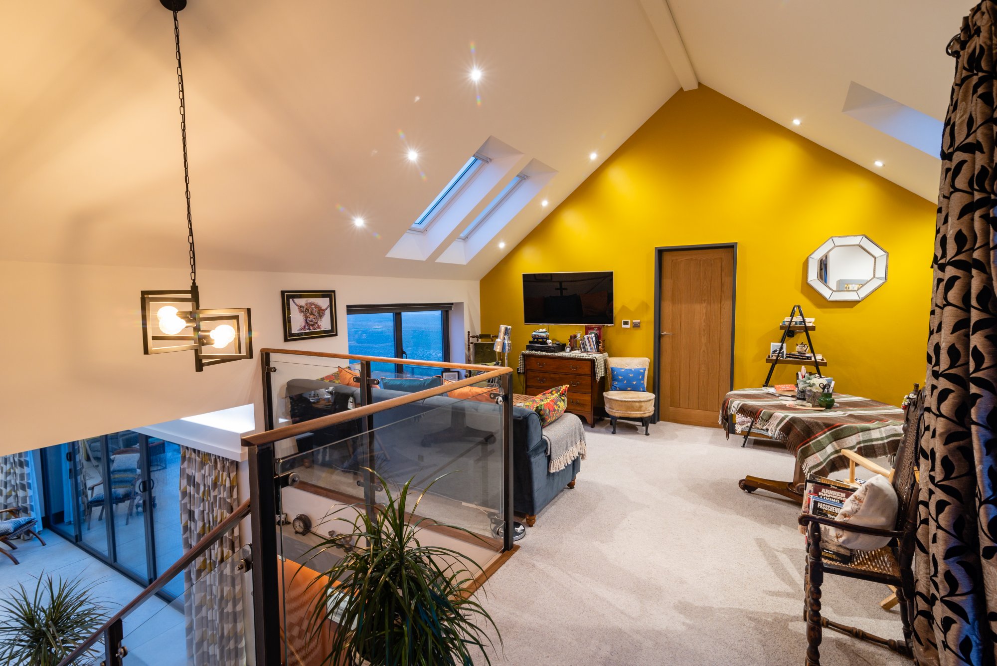The building contains a single garage for the annex, and a double garage for the main house. Above the garages are two bedrooms and a bathroom. The single storey section of the building provides the living, kitchen, dining space for the annex.